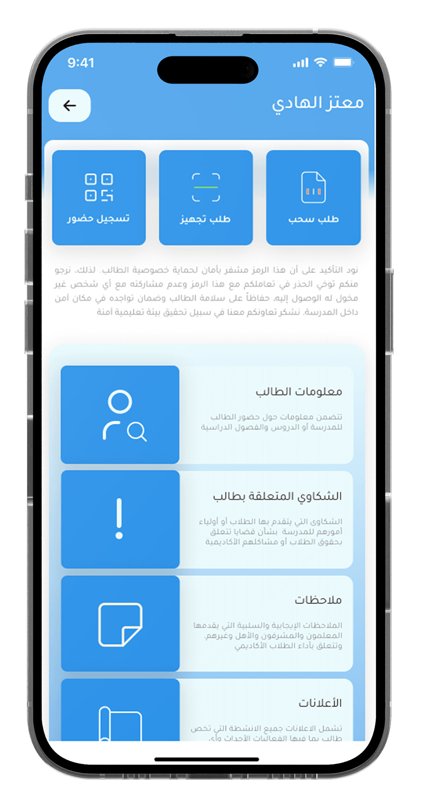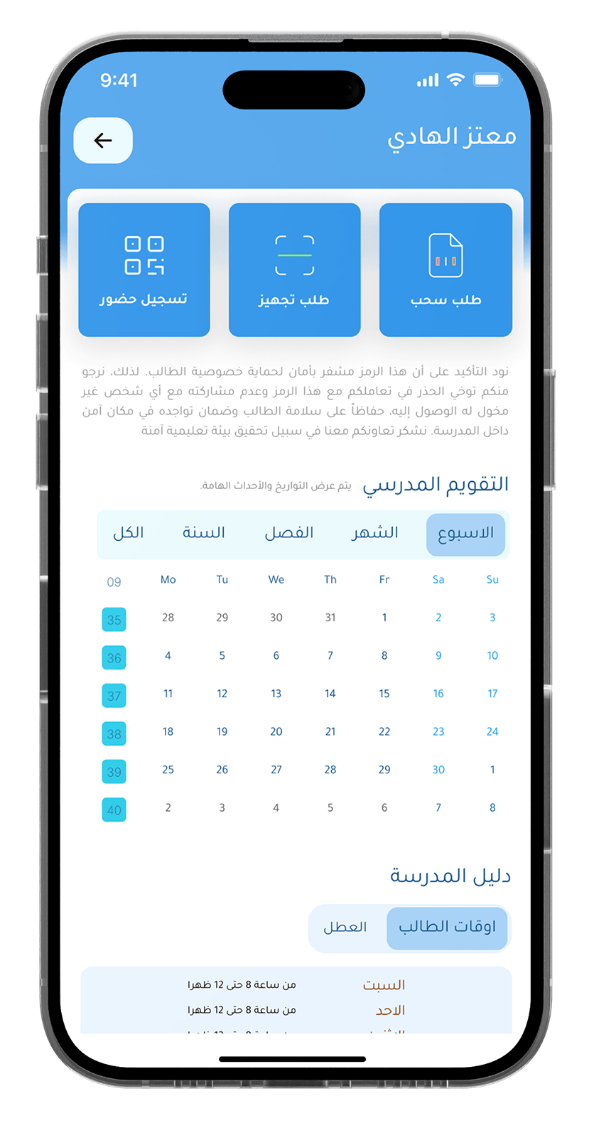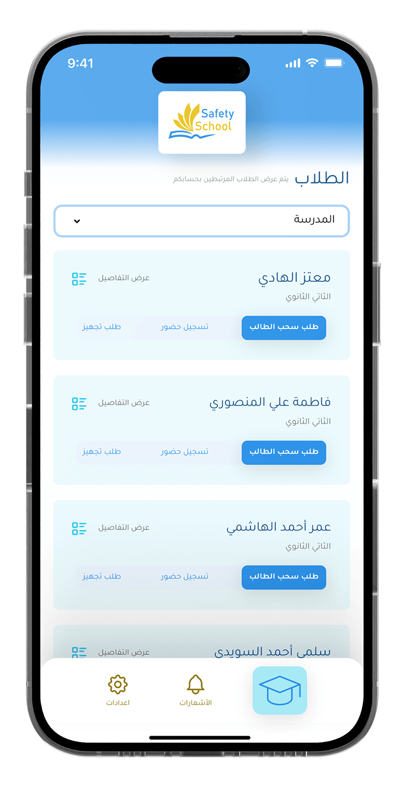 يضمن التطبيق مستوى أعلى من سلامة الطلاب من خلال توفير ميزات المراقبة والتتبع في الوقت الحقيقي، حيث يمكن للوالدين تلقي تنبيهات فورية لضمان راحة البال والحفاظ على بيئة تعليمية آمنة.