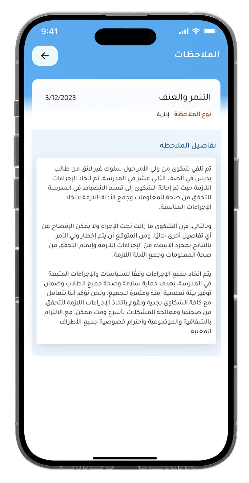 يساعد التطبيق في مراقبة وإدارة سلوك الطلاب، وتوفير رؤية شاملة للسجلات التأديبية والإنجازات والحوادث.